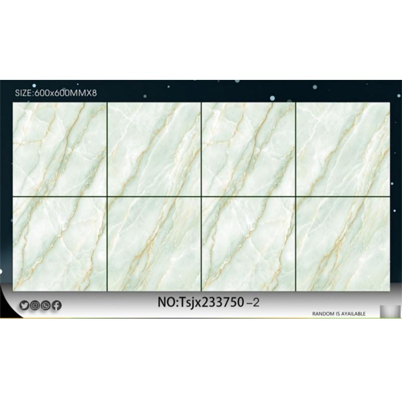 يتميز هذا البلاط الخزفي بسطح شديد اللمعان بألوان بيضاء أو خضراء راقية، مصمم لتعزيز الإشراق والوضوح البصري في المساحات الداخلية. وهو يعالج مشاكل مثل الأرضيات الباهتة، وعدم تجانس الألوان، وضعف انعكاس الضوء في البيئات المزخرفة. يُناسب هذا البلاط الاستخدام في المناطق السكنية والتجارية، بما في ذلك غرف المعيشة، والمتاجر، والفنادق، وقاعات الاستقبال.