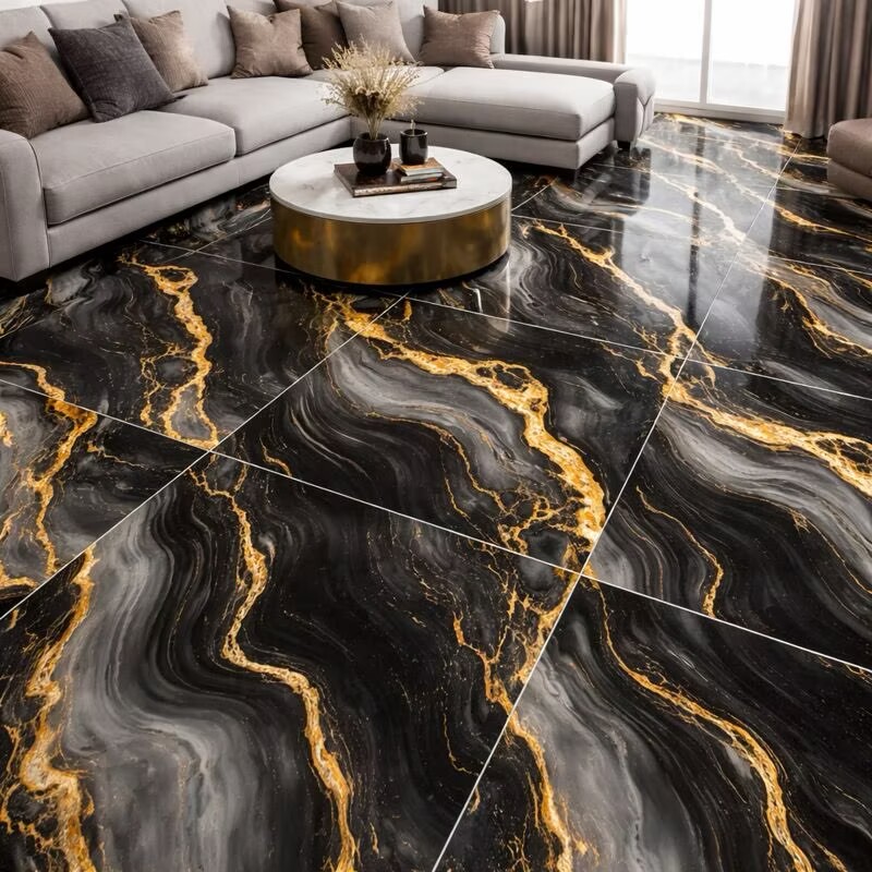 تتميز هذه البلاطة الخزفية بسطح لامع يجمع بين ملمس الحجر المصقول وتفاصيل عروق الذهب الأنيقة، مما يخلق مظهرًا عصريًا وجذابًا. يعزز السطح المصقول انعكاس الضوء مع الحفاظ على مظهر مستوحى من الرخام الطبيعي، مما يجعلها مناسبة لمختلف المساحات الداخلية. وبفضل معايير التصنيع الثابتة، توفر هذه البلاطة جودة عالية متسقة للاستخدام في الجدران والأرضيات السكنية والتجارية.