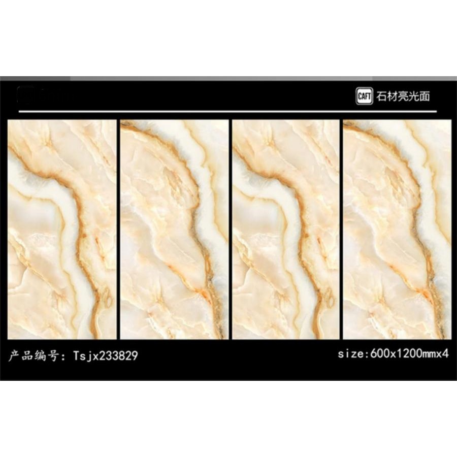 The surface displays a marble-style pattern with carefully balanced golden veining. The color transitions appear natural and well-organized across the tile face. This visual treatment supports a polished and elegant interior atmosphere.