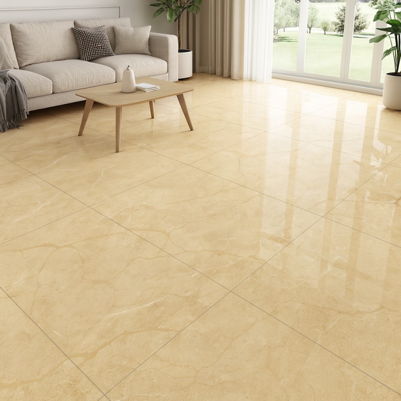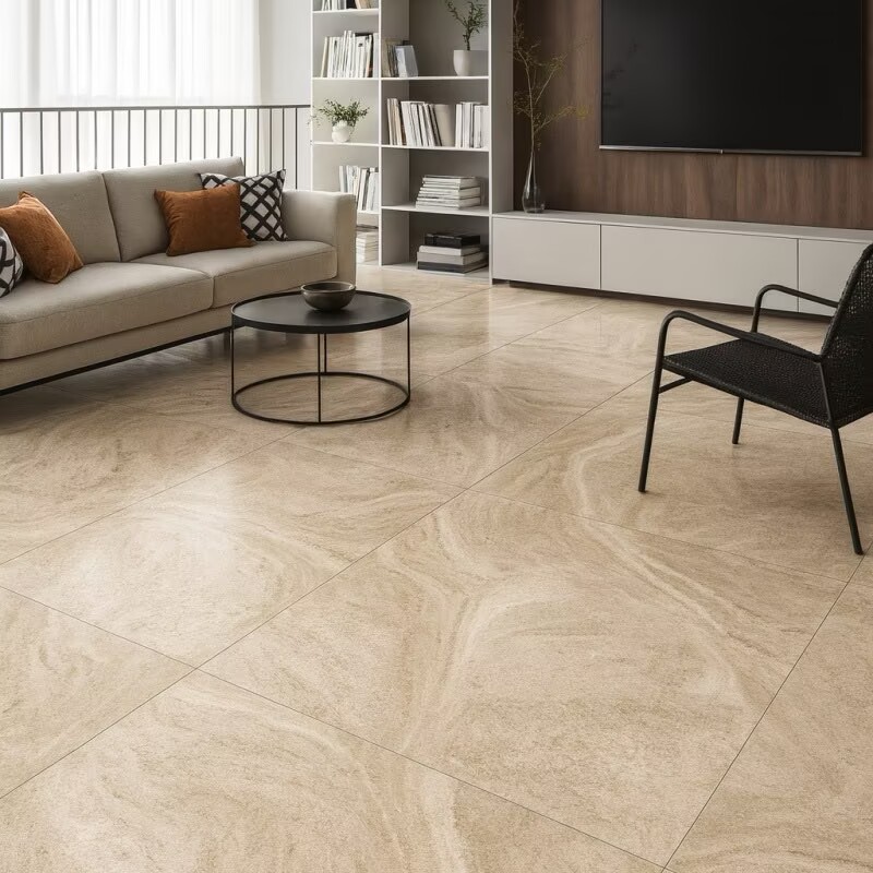 يتميز السطح بنقشة رخامية بيج طبيعية مع تدرجات لونية ناعمة. يُسهم هذا التصميم في خلق جو داخلي هادئ ومتناغم، ويتناسب مع أنماط الديكور المختلفة، بدءًا من المساحات البسيطة وصولًا إلى البيئات الفاخرة الأنيقة.
