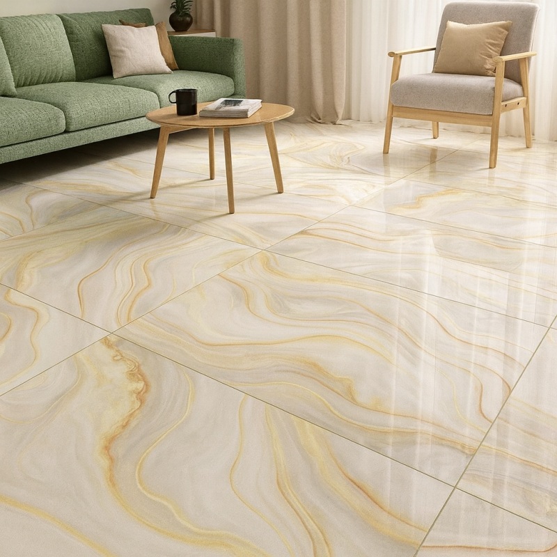 يتميز السطح بنمط رخامي أنيق مع انتقالات لونية متوازنة. يضفي هذا التصميم عمقًا بصريًا على المساحات الداخلية دون أن يبدو جريئًا بشكل مبالغ فيه. ويتكامل مع مجموعة واسعة من الأنماط الزخرفية، من المعاصرة إلى الكلاسيكية.