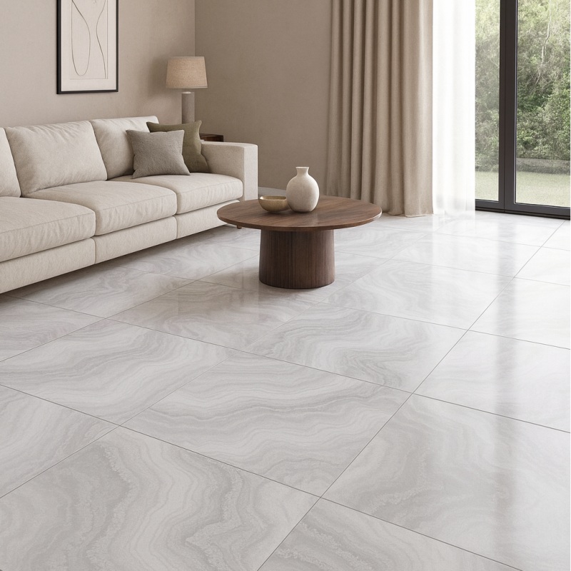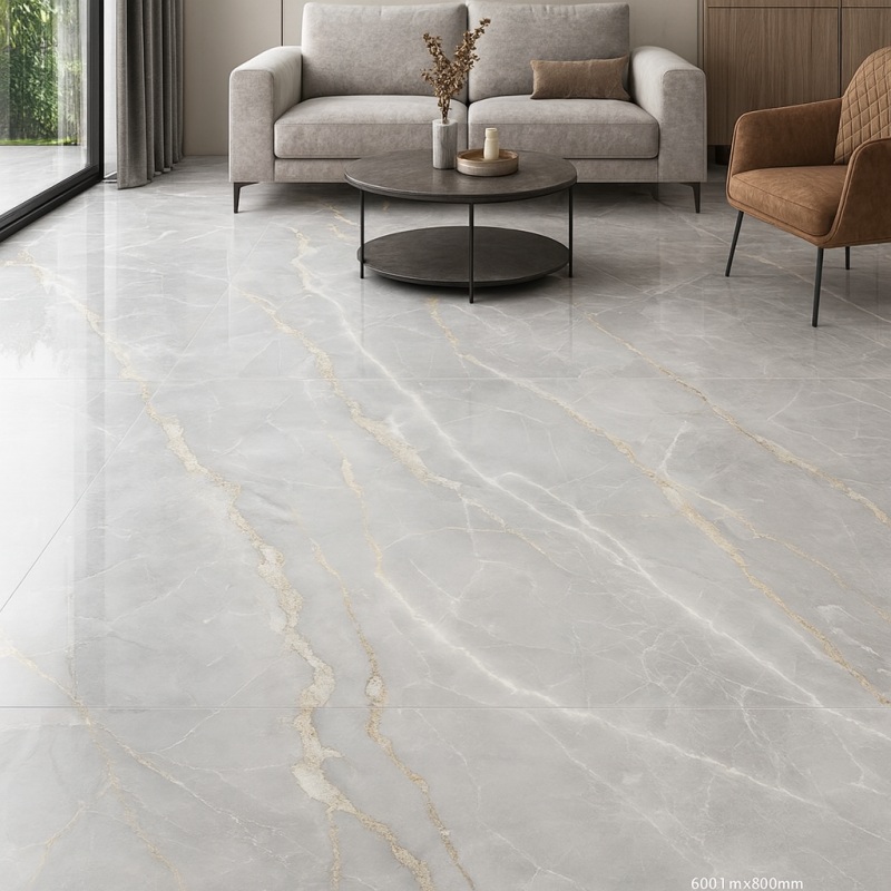 تتميز هذه البلاطات بلون رمادي فاتح مع عروق رخامية تُضفي لمسةً عصريةً على التصميمات الداخلية. يُبرز اللمعان هذا النمط، مما يمنح كل غرفة جوًا أكثر إشراقًا ورقيًا. كما أن توازن ألوانها يجعلها مناسبةً للمشاريع السكنية والتجارية على حدٍ سواء.