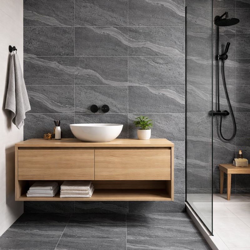 يتميز السطح بمظهر الحجر الطبيعي مع ملمس متناسق وانتقالات لونية هادئة. يضفي لمسة جمالية عصرية تتناغم مع التصاميم الداخلية البسيطة والمعمارية. ويحافظ التأثير البصري على ثباته حتى في تركيبات الجدران الكبيرة.